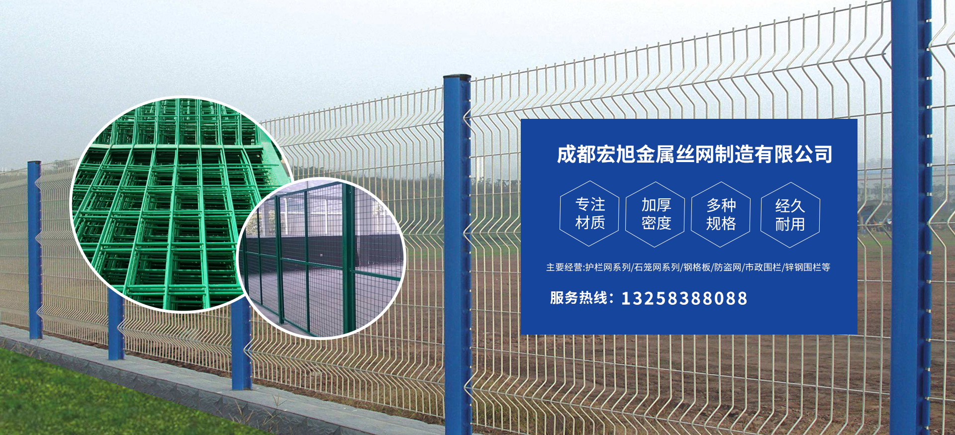 成都宏旭金屬絲網(wǎng)制造有限公司主營護(hù)欄網(wǎng)系列、石籠網(wǎng)系列、鋼格板、防盜網(wǎng)、市政圍欄、鋅鋼圍欄、鋼筋網(wǎng)片、聲屏障系列、波形護(hù)欄板、柔性纜索護(hù)欄、SNS邊坡防護(hù)網(wǎng)等其他絲網(wǎng)類產(chǎn)品。特殊規(guī)格可加工定做,也可根據(jù)客戶來圖來樣定做。自創(chuàng)業(yè)以來,公司一直堅持市場為導(dǎo)向,以客戶為根本,以實業(yè)為基礎(chǔ),以技術(shù)為支持,以科研為后盾,集科研、生產(chǎn)、經(jīng)營為一體,不斷研制開發(fā)新產(chǎn)品,開拓市場,走綜合發(fā)展之路。多年來,公司憑借過硬的質(zhì)量,良好的信譽(yù)、優(yōu)質(zhì)的服務(wù)、合理的價格,贏得了市場和商家的一致好評。